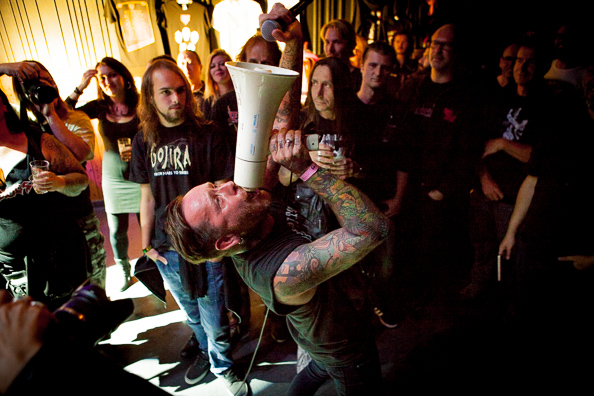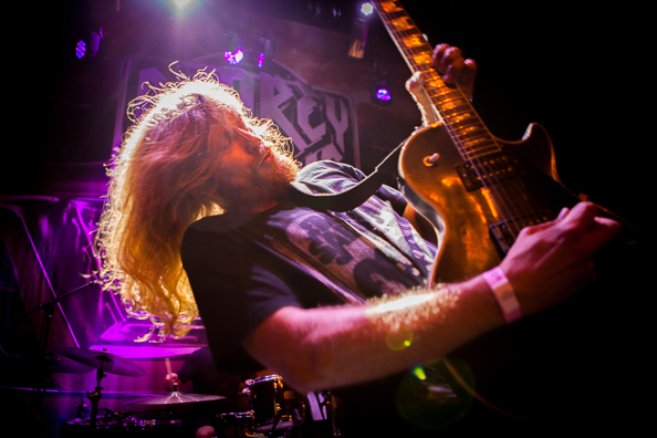 Bij binnenkomst in de kleine zaal van het nieuwe Leidse poppodium Gebroeders de Nobel blijkt de tap defect; een euvel dat desastreuze gevolgen kan hebben voor de sfeer in elke concertzaal, maar al helemaal wanneer die gevuld is met slechts een handvol metalheads. Gelukkig stroomt na een halfuurtje het bier weer, en er druppelt ook hoe langer hoe meer publiek binnen, zodat Dead Lord [bovenste foto] even na negenen onder de gebruikelijke omstandigheden aan zijn set kan beginnen.