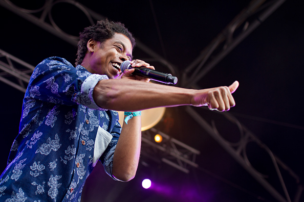Het vinden van een goede afsluiter die ook nog eens een opwindend optreden geeft, is altijd de achilleshiel van Into the Great Wide Open geweest, zodat het festival nogal eens als een nachtkaars uitging. Met Typhoon [foto hieronder] lijkt het dan eindelijk een keer te lukken. De ontwapenende rapper speelt vanaf de eerste beats een gewonnen wedstrijd. Het publiek eet uit zijn hand en doet alle armgebaren en dansjes zonder morren mee. Het is niet alleen maar hiphop wat voorbijkomt, maar ook jazz, reggae en funk komen langs, prettig aangezet door een blazerssectie. Tot ver achter de geluidstoren komt het publiek in beweging en dat is knap van de sympathieke Typhoon en zijn prima band.